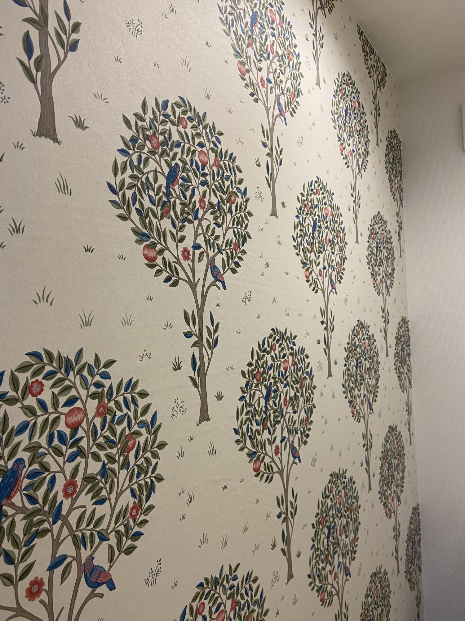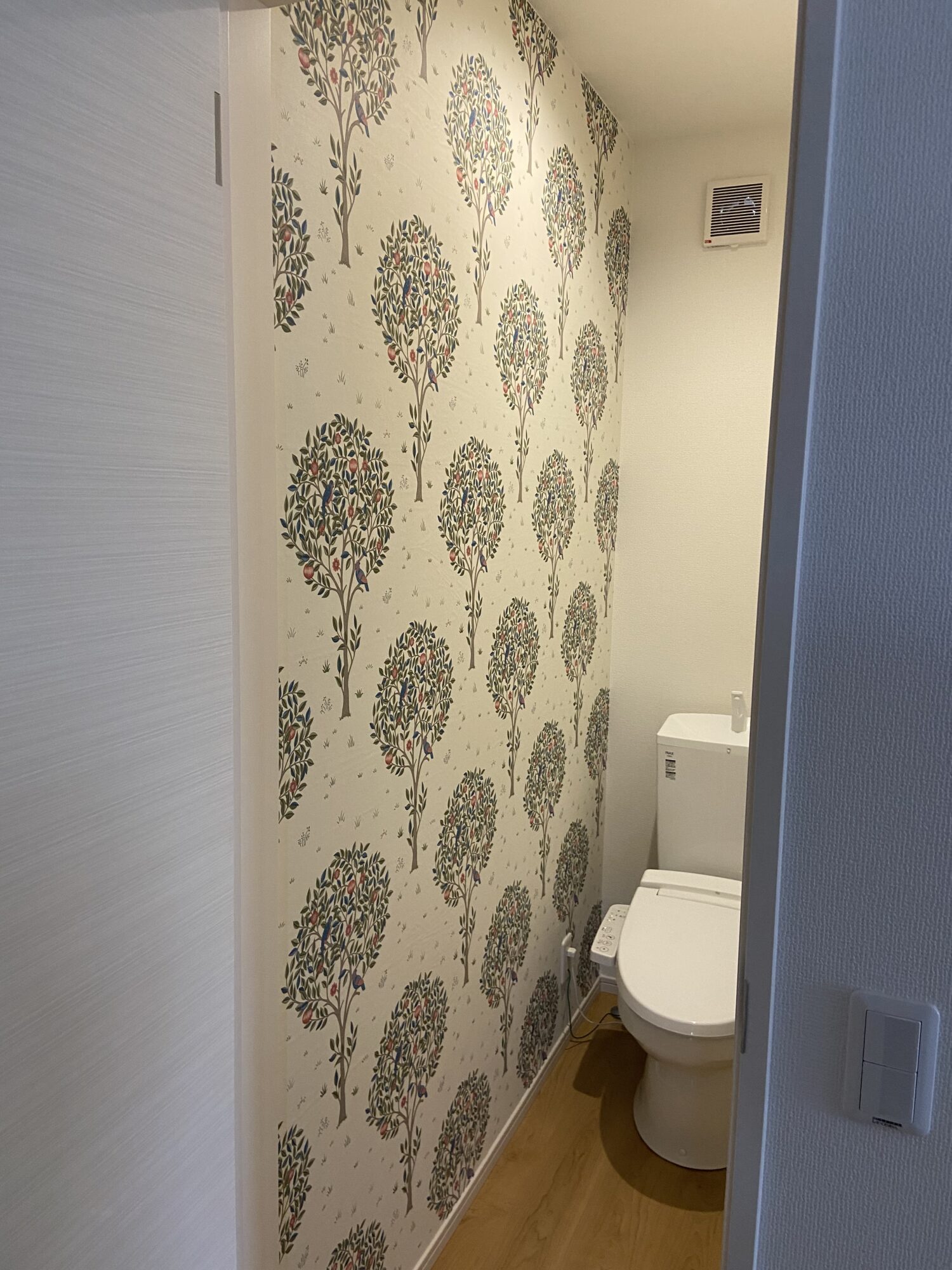 今回トイレに選ばれた壁紙は、ウィリアムモリスのデザインの壁紙で、自然な鳥などをモチーフにしたデザインが多いので、今回のお客様のイメージにぴったりでした。